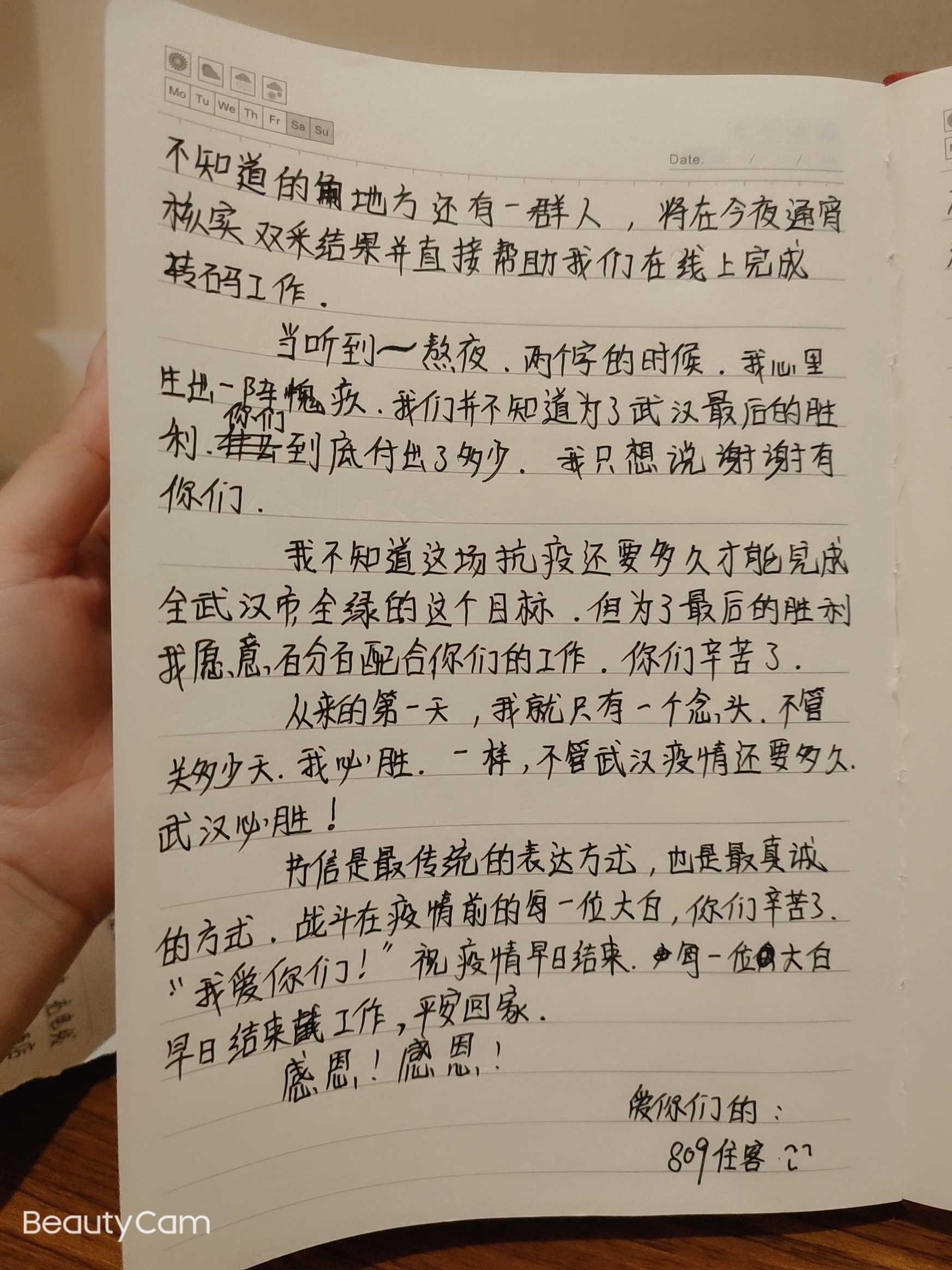长时间超负荷的工作状态,对我们医护工作者的体力和意志都是极大的考验。同时艰辛和努力的工作,得到了隔离人员的广泛理解与大力支持,隔离后,大家纷纷以各种形式表达对医护人员的感激之情,这也是我们医护人员坚守抗疫一线最振奋的鼓励。在疫情重压之下,白衣天使们用坚强的意志,在一个个平凡的工作岗位上铸就一个个不平凡的辉煌形象。