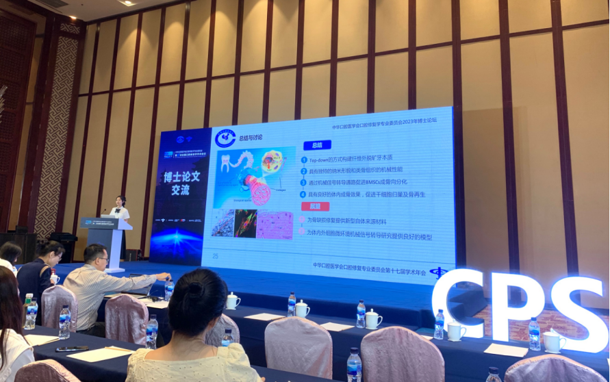 在“博士论文交流”活动中,11位来自全国各大高校的优秀博士生汇报了口腔修复专业领域的最新研究成果。我院黄翠教授指导的2016级八年制博士研究生吴小艺代表课题组进行了题为《纤维外脱矿牙本质用于骨再生的机制研究》的汇报并获评“表现突出”奖项。