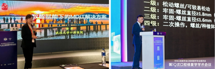 在多个核心专场,我院专家带来了系列精彩报告。黄翠教授于“疑难修复跨学科合作”专场,以《数智赋能下疑难病例的MDIT解决方案》为题做主题演讲,深度探讨了数智时代背景下跨学科疑难病例合作的规范化实施路径;周毅主任医师先后在“复杂种植上部修复”专场和“修复并发症防控”专场,就《个性化种植修复的基台选择》和《种植体中央螺丝折断的处理策略》发表主题演讲,将多年种植修复的临床心得倾囊相授。