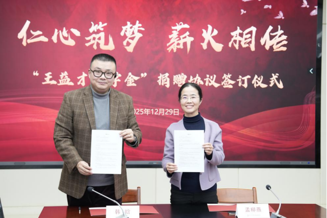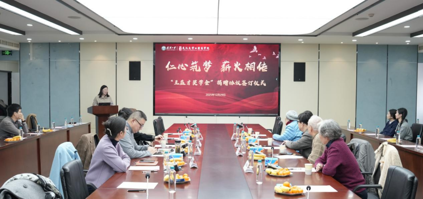 2025年12月29日,由我院第一任党支部书记、八路军老战士王益才同志命名的“王益才奖学金”捐赠协议签订仪式在我院一号楼九楼会议室正式举办。党委书记付宏宇、党委副书记、纪委书记何小华、副院长孟柳燕等领导出席了仪式,与王益才同志在我院创院时期并肩战斗过的老专家樊明文教授、李金荣教授、胡传真教授、石岷华老师也应邀出席,王益才同志的长孙、武汉大学国家文化发展研究院副教授韩晗作为捐赠方及家属代表,应邀出席本次仪式。参加捐赠仪式的还有离退休工作处、教学办、学工办的老师以及教师、学生代表。